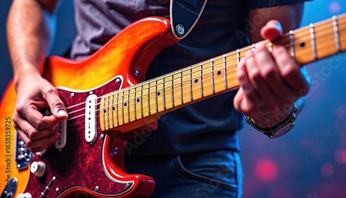Musician plays electric guitar with vibrant, colorful strokes creating artistic, fluid effect. Close-up on hands, strings, fretboard. Digital painting fiery energy, perfect for music promotion, art