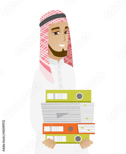 Muslim businessman holding pile of folders.