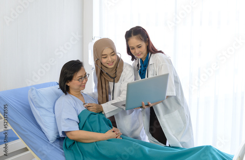 Muslim female doctor using stethoscope checking pressure and young asian female doctor hold laptop and giving advice discussion to elderly patient lie down on bed at hospital. Medicine and health