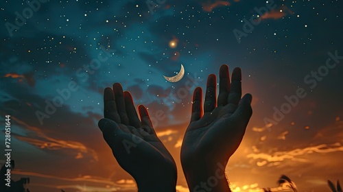 Muslim hands raised in prayer against the backdrop of a dark sky adorned with twinkling stars and a crescent moon, symbolizing the divine connection and reverence felt during moments of worship.