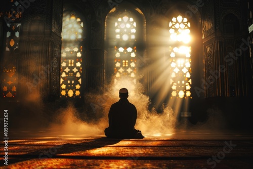Muslim man praying for fasting and Eid in mosque silhouette.