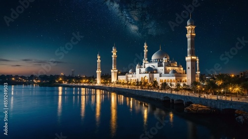 Muslim mosque with river in front, atmosphere of the mosque at night, Muslim place of worship, mosque, prayer, Ramadan, Muslims