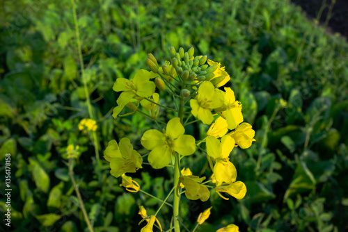 Mustard Flower wild yellow flower Plant in the green field outside. Closeup Mustard Flower plant Growing Beautiful scene. Oil is extracted from seed of mustard plant.