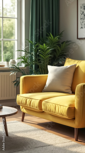 couch, yellow, plant, sunlit, room, interior, design, home, decor, furniture, living, space, relaxation, comfort, cosy, modern, style, bright, light, airy, natural, window, curtain, beige, pillow, texture, fabric, wooden, leg, floor, carpet, green, leaf, pot, peaceful, serene, calm, tranquil, aesthetic, minimal, simple, elegant, sophisticated, stylish, clean, brightly, lit, warm, inviting