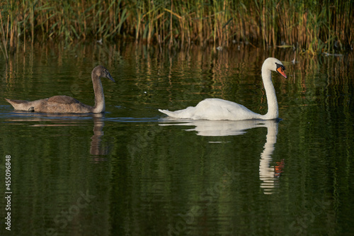 Mute Swan (Cygnus olor) with nearly full grown cygnet swimming on a lake at Ham Wall in Somerset, England, United Kingdom