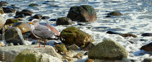 gull, vogel, baltic sea, sea, coast, shore, rock, stone, wave, spray