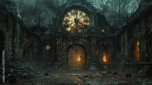clock, tower, ruin, mist, darkness, ancient, eerie, secret, decay, haunting, forgotten, architecture, vertical, shadow, landscape, light, nature, history, urban, mystery, gloom, atmosphere, weathered, time, passage, relic, overgrown, enchanted, abandoned, enchanting, time, stillness, view, building, face, mystical, surreal, old, earth, crumbling, nostalgia, twilight, sombre, generative, ai