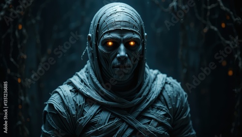 Mysterious Ancient Mummy With Glowing Eyes Surrounded by Dark Shadows in a Mystic Forest