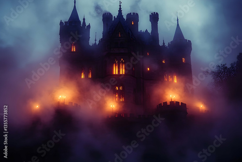 Mysterious castle shrouded in fog with glowing windows and eerie atmosphere at twilight