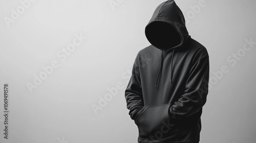 Mysterious figure in a black hoodie standing against a white background in a minimalist setting