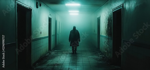 hospital, corridor, figure, mysterious, derelict, horror, film, scene, dark, shadow, fog, creepy, scarey, abandoned, building, hallway, man, walking, alone, night, eerie, suspense, fear, thriller, mystery, haunted, desolate, gloomy, ominous, anxiety, tension, atmosphere, mood, psycho, ghost, paranormal, supernatural, silence, darkness