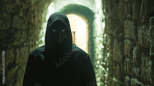 masked, figure, threat, mystery, dark, corridor, stone, eerie, silhouette, shadow, character, unknown, fear, suspense, edge, narrow, atmosphere, light, haunting, isolation, path, intimidation, drama, sight, concealment, emotion, ambiguous, tension, scene, fashion, photo, art, design, visual, landscape, cold, fog, depth, enigmatic, night, backlight, expression, interpretation, minimalism, narrative, location, storytelling, perspective, element