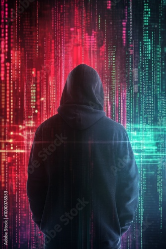 hooded, figure, digital, background, datum, visualisation, technology, mystery, cyber, neon, light, modern, art, anonymity, silhouette, night time, computer, code, security, hacking, earth, electronic, pattern, vibrant, colours, urban, environment, intrigue, privacy, coded, information, futuristic, abstract, hacker, culture, glowing, isolation, analysis, visual, effect, mysterious, atmosphere