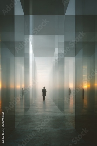 figure, dawn, glasses, silhouette, labyrinth, atmosphere, shadow, morning, light, space, introspection, mist, aethereal, surreal, simplicity, environment, solitude, architecture, perspective, art, design, calmness, scenery, calm, exploration, beauty, depth, contemplation, journey, clarity, serenity, visual, structure, life events, horizon, fog, illusion, creativity, landscape, stillness, nature, wonder, enchantment, emotional