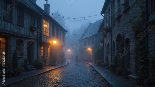 fog, mist, mystery, night, evening, village, town, europa, european, cobbled, street, lamp, light, cosy, atmospheric, moody, dark, travel, tour tourism, architecture, historic, cinematic, dramatic, scenic, picturesque, wallpaper, background