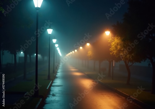 city park, street light, fog, night time, tranquil, serenity, nature, tree, calm, solitude, atmosphere, landscape, moody, city lights, evening, mist, travel, scenery, quiet, picturesque, shadow, calmness, ambience, outdoor lighting, soft light