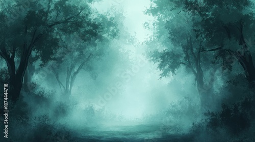 Mysterious forest background with dense trees and thick fog, soft light filtering through, creating an eerie atmosphere