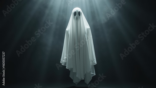 Mysterious ghost figure draped in white sheet, illuminated by beams of light in dark setting, evokes sense of intrigue and eeriness