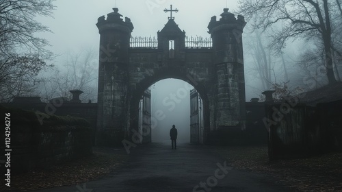 gothic, archway, misty, forest, landscape, eerie, moody, atmospheric, dark, mysterious, skittish, ominous, dreary, gloomy, foreboding, creepy, sinister, haunting, brooding, enigmatic, obscure, cloaked, sombre, melancholic, architecture, arched, gateway, church, cross, weathered, abandoned, secluded, remote, desolate, solitary, silhouette, mist, fog, overcast, dusk, twilight, shadow
