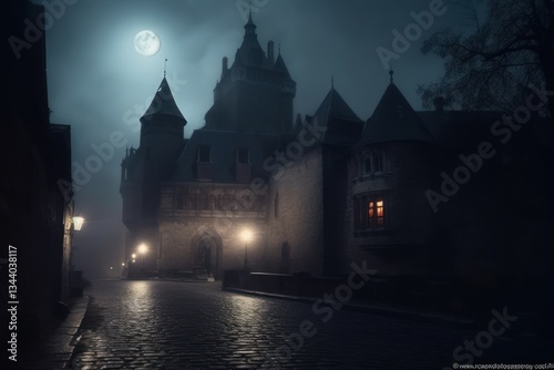Mysterious Gothic Castle at Night with Foggy Atmosphere and Dim Gas Lamps
