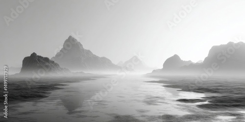 Mysterious Graayscale Landscape with Foggy, Reflective Surface and Moody Atmosphere