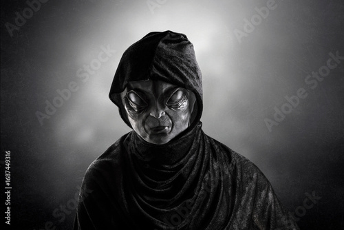 alien, flying saucer, specter, creature, cloak, android, martian, mystic, spook, skittish, figure, halloween, scarey, evil, creepy, black, darkness, horror, dark, bad, danger, form, unreal, grim, bogey, robe, weird, clothes, strange, mask, hood, foggy, hooded, cape, dress, face, clothes