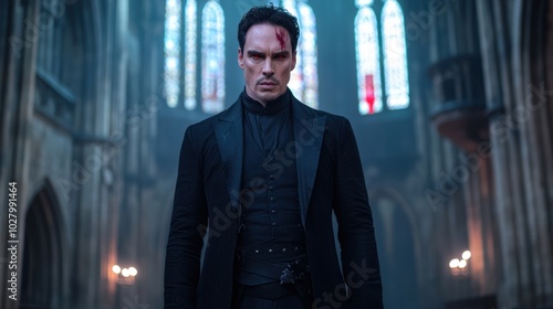 Mysterious man in dark attire stands in a dimly lit cathedral