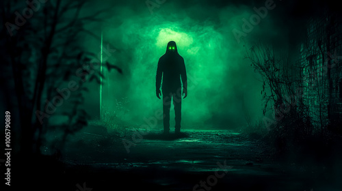 man, mysterious, glowing, eye, fog, alley, night, eerie, skittish, creepy, horror, halloween, dark, shadow, silhouette, scarey, danger, mystery, thriller, fear, green, atmospheric, urban, street, background