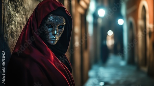 mask, cloak, mysterious, night, dimly, lit, figure, red, street, masked, enigma, dark, alleyway, hooded, disguise, evening, shadowy, secrecy, twilight, concealed, facades, costume, time, eerie, hidden, intrigue, surreal, urban, street light, anonymous, secretive, haunting, mystery, pathway, unknown, phantom, obscure, veiled, corridor, labyrinth, elusive, enigmatic, alley, background, copy space, carnival