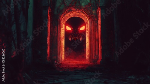 door, entrance, red, light, shadow, stone, wall, dark, mystery, fantasy, building, architecture, ancient, entranceway, gateway, mystic, portal, passage, path, hidden, secret, unknown, doorway, room, structure, interior, design, style, haunted, gothic, ruin, old, vintage, brick, concrete, abstract, futuristic, darkroom, glowing
