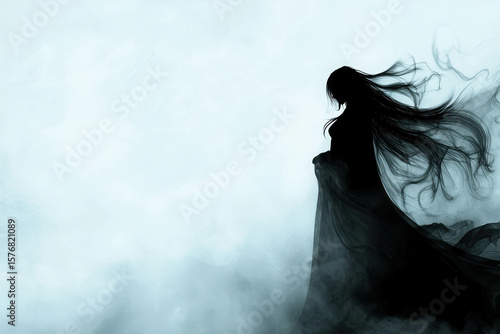 silhouette, figure, hair, flowing, mysterious, aethereal, background, blurred, dreamlike, atmosphere, shadow, art, creativity, emotion, mystery, beauty, monochrome, fog, elegant, standing, peaceful, dramatic, haunting, stillness, serenity, impression, fantasy, nature, mood, isolation, calm, elegance, tradition, shadow, soft, contrast, portrait, visual, escape, inspiration, depth, aesthetic