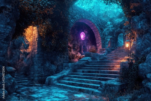 mystical, staircase, forest, glowing, lantern, enchanted, night, pathway, ancient, stone, light, shadow, stair, foliage, architecture, magic, landscape, atmosphere, exploration, adventure, fantasy, scenery, illumination, nature, tranquil, surreal, step, garden, beauty, mysterious, serene, ambience, colours, dusk, twilight, enchanting, unique, calmness, ruin, aethereal, environment, dreamscape, wonder, night time
