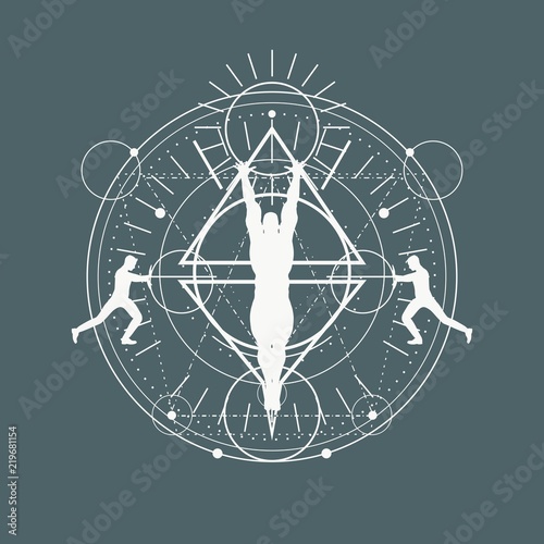 Mystery, witchcraft, occult and alchemy tattoo sign. Mystical vintage gothic geometry thin lines symbol with silhouettes of a men