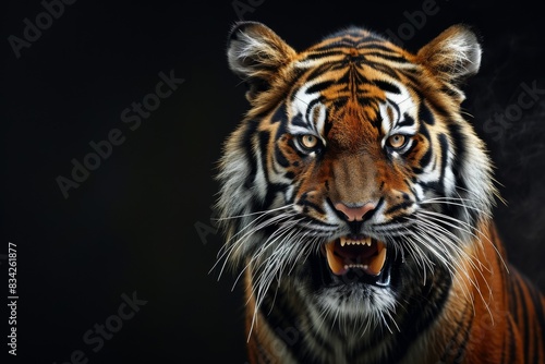 Mystic portrait of Bengal Tiger in studio, copy space on right side, Anger, Menacing, Headshot, Close-up View Isolated on black background