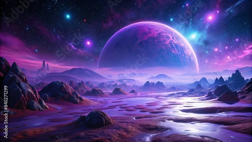 space, alien, landscape, purple, planet, star, fantasy, science fiction, mountain, river, night sky, celestial bodies, digital artwork, imagination, exploration, vibrant, aethereal, panoramic, majestic