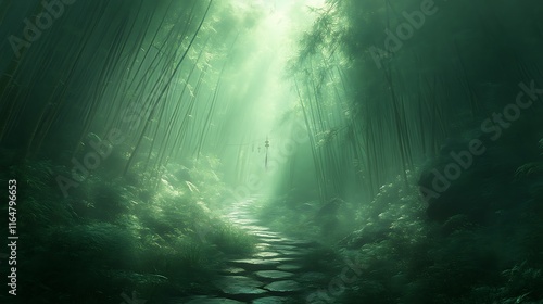 bamboo, forest, path, step, stone, sunlight, mystical, green, fog, mist, tree, leaf, plant, nature, scenic, landscape, tranquil, serene, peaceful, calm, quiet, atmosphere, moody, magical, aethereal, dreamlike, fantasy, mysterious, secret, hidden, journey, adventure, exploration, light, shadow, depth, perspective, vibrant, colours, texture, detail, beauty