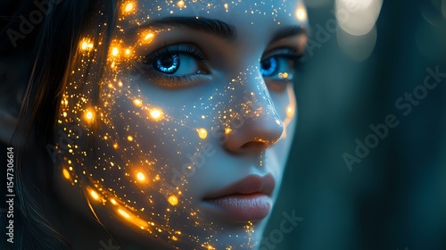 magical, face art, sparkle, mystical, aethereal, dark background, blue eye, lichterkette, fantasy art, dreamy, mysterious, atmospheric, enchanted, celestial, cosmic, stardust, night sky, digital artwork, glamour, feminine, face painting