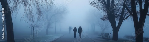Mystical foggy winter morning in an urban park surrounded by leafless trees and silhouetted figures walking together