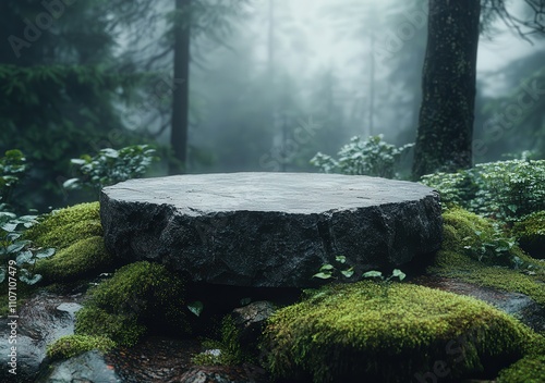 forest, misty, mossy, stone, platform, rock, nature, background, display, product, showcase, mystical, magical, serene, tranquil, green, wood, tree, foliage, damp, wet, dark, mysterious, fantasy, fairy tale, enigma, secret, hidden, calm, peaceful, outdoors, environment, eco, organic