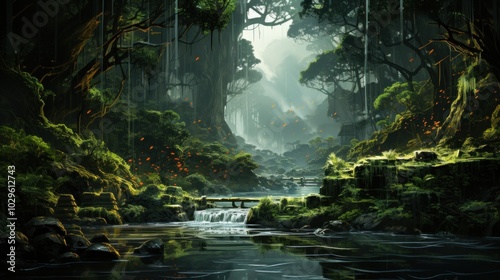 forest, stream, tree, water, nature, green, leaf, lush, river, fantasy, landscape, waterfall, moss, rock, jungle, wood, path, light, sunlight, dark, mystical, magical, calm, peaceful, serene, tranquil, dreamy, enchanted, hidden, secret, fog, mist, foggy, misty, bright, soft, shadow, ambient, digital, art, illustration, artwork