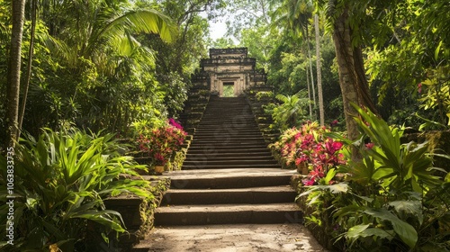 jungle, path, temple, entrance, grand, lush, palm, tree, colourful, flower, adventure, exploration, mystical, scenery, picturesque, exotic, tropical, natural, beauty, vibrant, serenity, tranquil, hidden, secret, ancient, sacred, nature, travel