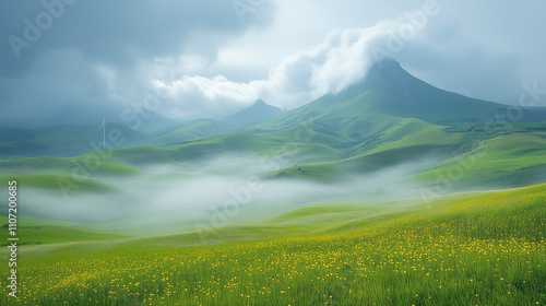 Mystical Mountain Meadow: A serene landscape unfolds with rolling hills, misty valleys, and majestic mountains shrouded in ethereal clouds.