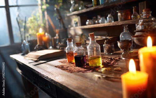 room, mystical, symbol, shadowy, ambience, dim, candle, light, potion, table, herb, glasses, bottle, book, magic, nature, atmosphere, vintage, mysterious, shadow, glow, decor, detail, enchanting, setting, interior, wooden, surface, craft, art, fantasy, quiet, peaceful, design, illumination, creativity, exploration, aesthetic