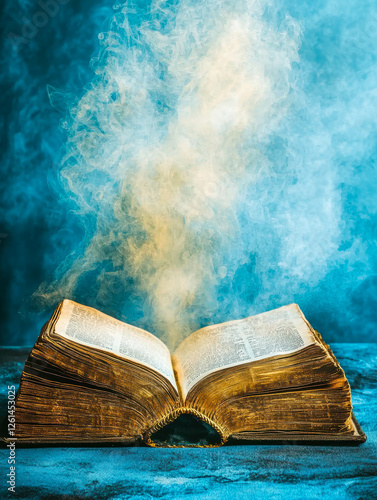 Mystical Smoke Rising from Open Vintage Book on Blue Background