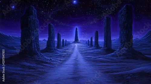 Mystical stone circle under starry night sky enchanting landscape with ancient monoliths evoking spiritual mystery in a nocturnal setting