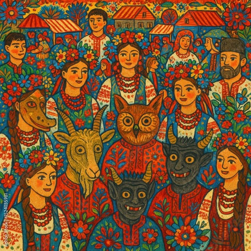 ukrainian, folklore, festival, village, woman, spirit, mythical, animal, mask, tradition, costume, celebration, flower, floral, crown, embroidery, colours, bright, culture, heritage, folk, legend, myth, devil, creature, parade, gathering, ceremony, root, art, illustration, oneness, happiness, joyful, watchful, dance, music, community, colourful, scene