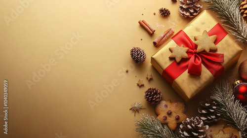 Na jasnym złotym tle rozciąga się elegancka kompozycja bożonarodzeniowa, w której centralne miejsce zajmuje piękny złoty pudełko prezentowe ozdobione czerwoną wstążką