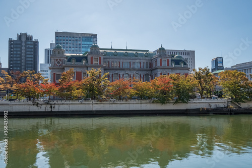 central, public, hall, city, osaka, japan, river, autumn, leaf, skyline, water, architecture, park, landscape, building, city landscape, urban, building, sky, panorama, bridge, blue, travel, duck pond, downtown, view, skyscraper, central park, green