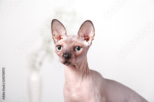 Naked Cat breed canadian Sphinx sitting on a white blurred background with a vase of flowers. Morning spring mood