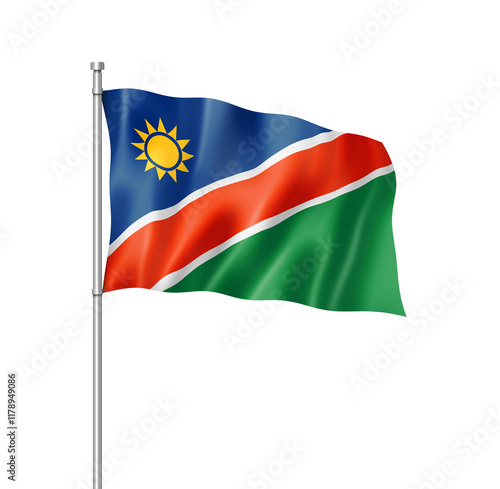 flag, namibia, national flag, waving, textile, isolated on white, isolated, symbol, banner, earth, curve, wind, fold, rippled, national, blue, red, green, three-dimensional, three-dimensional, texture, textured, background, illustration, front view, insignia, full frame, closeup, nation, design, concept, travel, country, pole, flag pole, flag pole, transparent